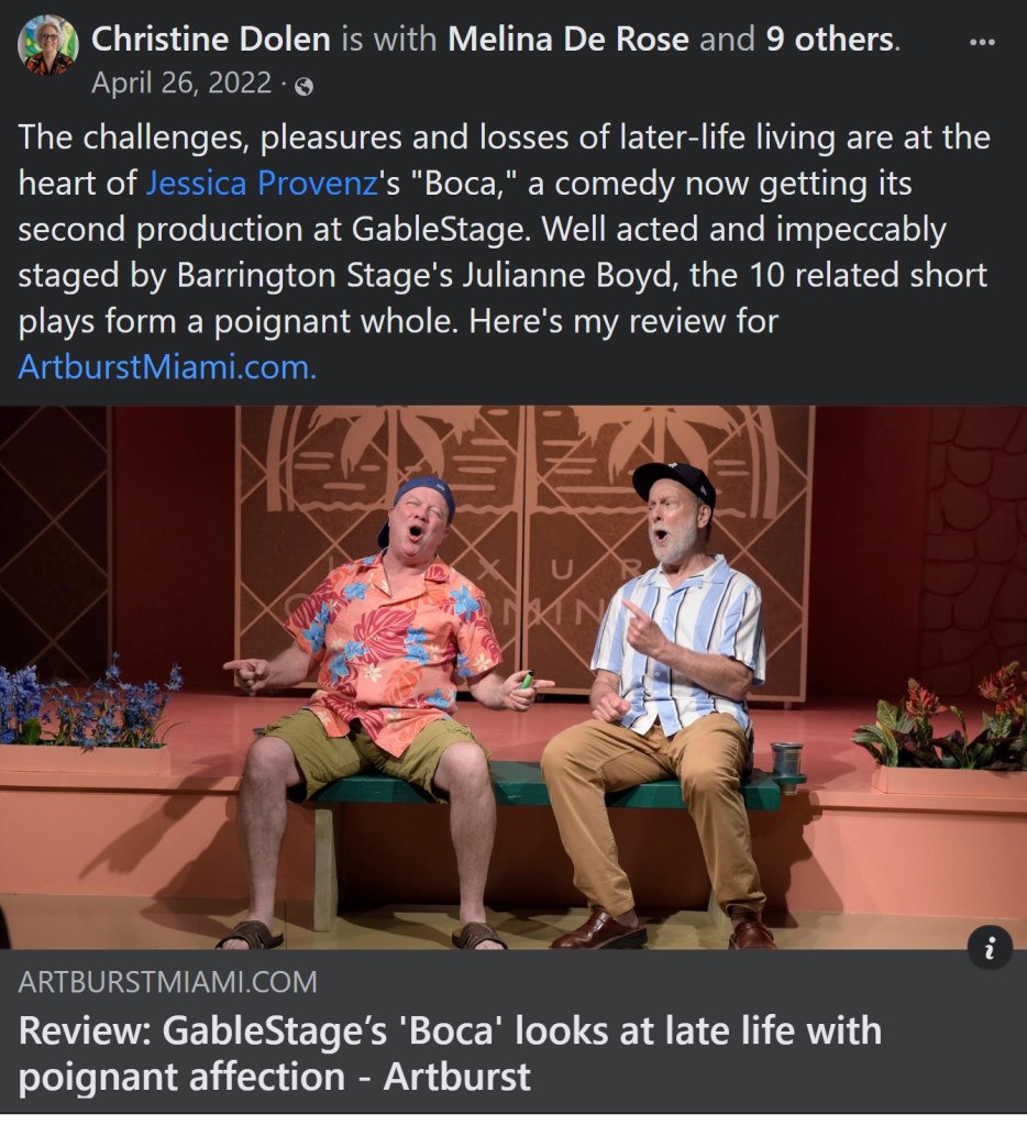 “A chuckle-fest as well-constructed and skillfully executed as any episode of The Golden Girls, the Mary Tyler Moore show or a Carol Burnett skit.”- BILL HIRSCHMAN – April 2022 (Florida Theater on Stage)